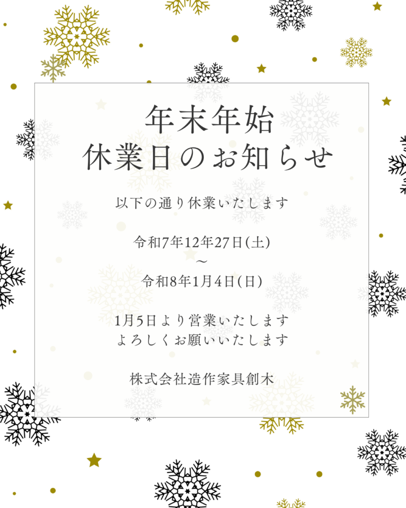 年末は27日よりお休みをいただきます。年始は5日から営業いたします。