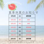 2024年7月24日 / 最終更新日時 : 2024年7月24日 soumoku お知らせ 令和6年夏季休業のお知らせ 静岡市は最近どうしちゃったんでしょうね、本日の最高気温の常連になってしまってます。今日も全国トップの38.8℃です。それでもあの40℃の時よりはマシだなあと思ってしまいます。 さて、7月も終わりに近づき、いよいよ8月です […]