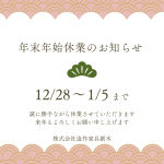 2024年12月24日 / 最終更新日時 : 2024年12月24日 soumoku お知らせ 年末年始休業のお知らせ 12月も押し迫ってまいりました、今年は奇跡の9連休ですね!弊社も世間と同じように12/28から1/5までお休みいただきます。どうぞよろしくお願いいたします。今年もお世話になりました!