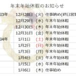 2021年12月22日 / 最終更新日時 : 2021年12月22日 soumoku お知らせ 年末年始休暇のお知らせ 今日は冬至ですね。ここのところ朝晩の冷え込みはなかなかのものですが、日中は結構暖かいので助かっています。今年も残すところ10日を切りました。例年通り年末年始休暇を取らせて頂きますのでお知らせです。今年は一日早いです。大掃 […]
